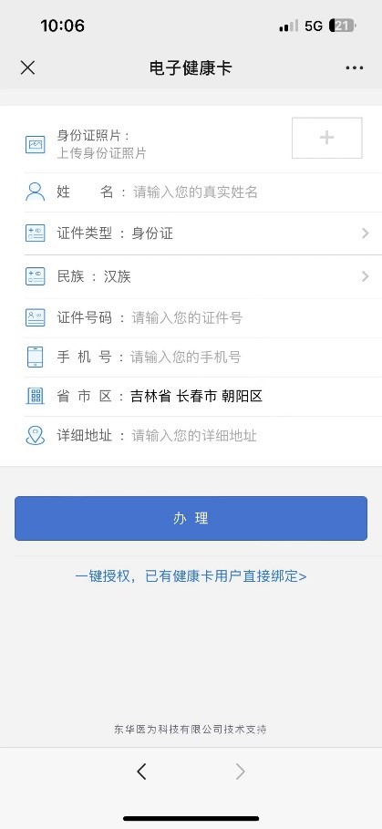 當前位置:首頁 > 就醫(yī)指南 > 患者服務 患者注冊建卡 來源:吉林省腫瘤醫(yī)院 時間:2022-11-14 瀏覽: 次 第一步:點擊吉林省腫瘤醫(yī)院微信服務號第二步:點擊【個人中心】-【個人中心】-【電子健康卡】- -上傳身份證+手機號/填寫個人信息--點擊【辦理】