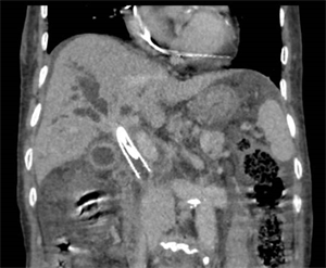 患者是一名79歲的女性,因皮膚、鞏膜黃染,尿色加深3天就診于我院。入院肝功結(jié)果提示膽紅素升高,總膽紅素高達(dá)422umol/L。肝臟增強(qiáng)MRI提示:肝總管/膽囊管匯合處腫物,考慮惡性,并繼發(fā)肝內(nèi)膽管擴(kuò)張。初步診斷為肝總管腫物、梗阻性黃疸。經(jīng)腹部腫瘤外科會(huì)診認(rèn)為該患高齡,且腫物位于肝門部,外科手術(shù)風(fēng)險(xiǎn)大,出血幾率高,家屬不同意行外科治療。孫志強(qiáng)團(tuán)隊(duì)會(huì)診后判斷,該患梗阻部位處于肝總管、膽囊管交匯處,屬高位膽管梗阻,不宜行內(nèi)鏡下逆行膽管引流術(shù)(ERCP),可行經(jīng)皮肝穿刺膽管引流術(shù)(PTCD),再根據(jù)膽管造影情況來(lái)判斷能否行膽道支架置入術(shù)。擬行DSA引導(dǎo)下膽道活檢聯(lián)合膽道支架植入術(shù),為后續(xù)治療創(chuàng)造機(jī)會(huì),患者家屬表示同意,要求行該治療方案。在明確患者沒(méi)有手術(shù)禁忌癥后,團(tuán)隊(duì)于CT導(dǎo)引下行PTCD,后于DSA導(dǎo)引下行膽管造影。因膽管梗阻嚴(yán)重,造影后無(wú)法通過(guò),即便利用導(dǎo)絲導(dǎo)引也十分困難。經(jīng)過(guò)反復(fù)嘗試和更換不同硬度導(dǎo)絲后,終于導(dǎo)絲越過(guò)梗阻部位,導(dǎo)絲導(dǎo)引導(dǎo)管成功完成膽道造影,明確了梗阻的部位和長(zhǎng)度,最終順利完成了本次膽道支架置入手術(shù)。