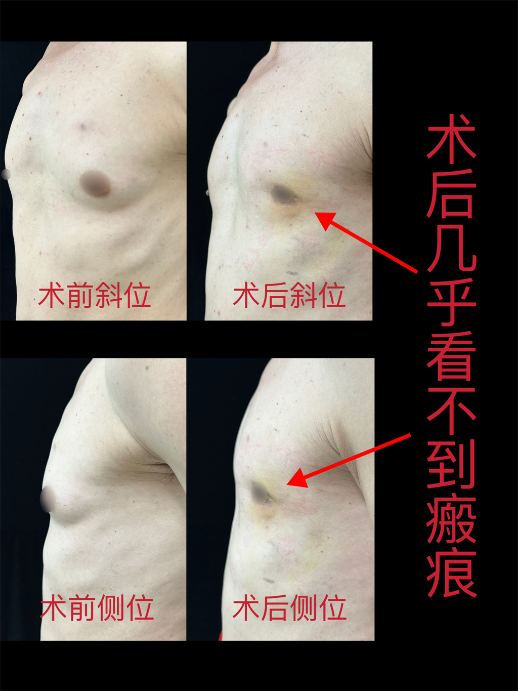 據(jù)周子君介紹,男性乳腺發(fā)育的患者,不但存在乳房腺體的發(fā)育,胸部形態(tài)也存在異常,手術(shù)不但要完整切除乳腺腺體,還要改善胸部的異常形態(tài)。有研究結(jié)果表明,傳統(tǒng)的乳暈切口乳腺切除術(shù)的創(chuàng)傷較大,切口愈合后易遺留明顯瘢痕而影響外觀;此外對(duì)于乳腺內(nèi)及其周圍脂肪組織豐富的患者,乳暈切口乳腺切除術(shù)仍不能有效將增生腫大腺體切除,且術(shù)后極易形成乳房中央凹陷等不良形態(tài)。而吸脂聯(lián)合小切口乳腺切除術(shù)患者的疼痛感較輕,切口愈合后瘢痕隱蔽,不影響乳房外觀。